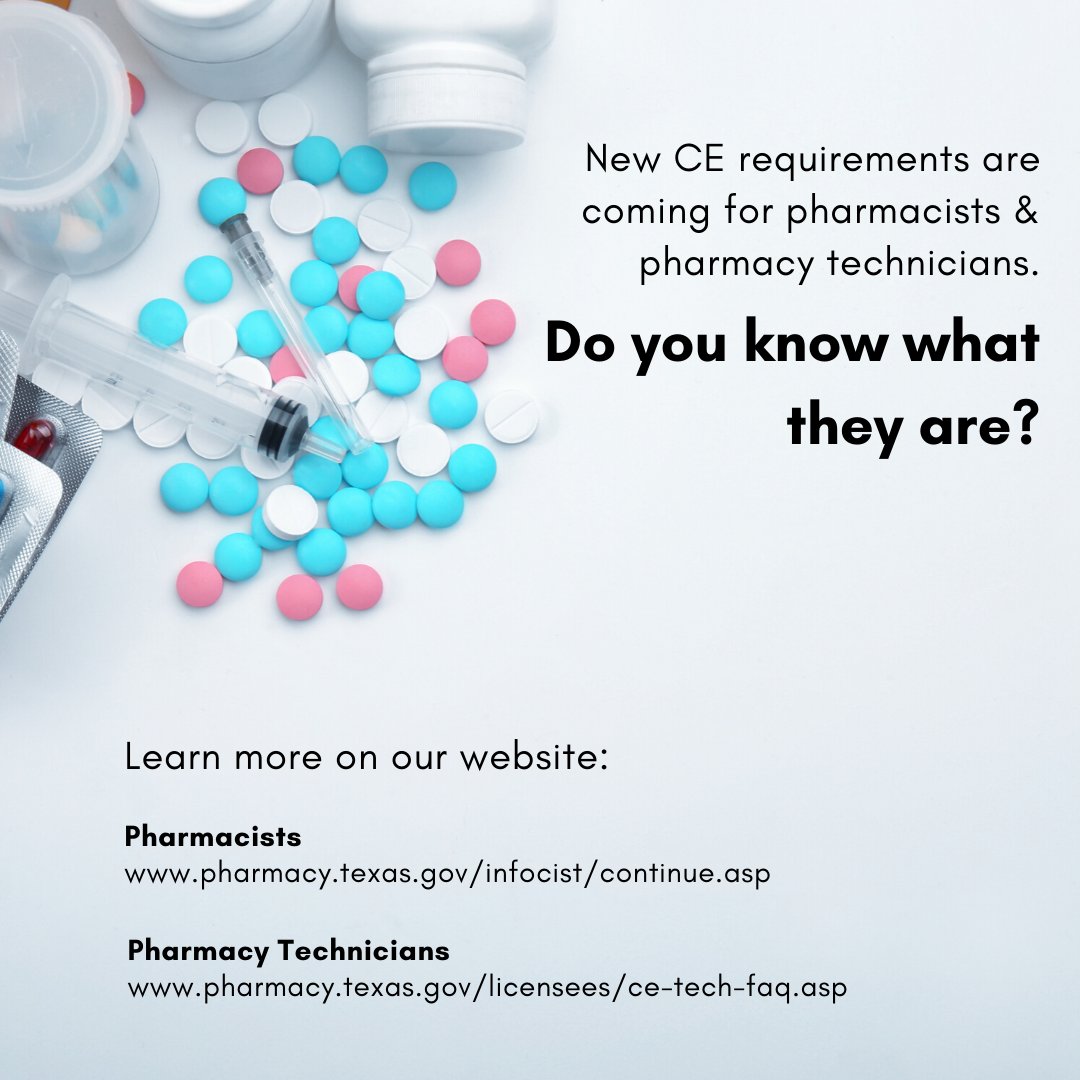 Tx Pharmacy Board On Twitter There Are New Ce Requirements Coming For Pharmacists And Pharmacy Technicians Learn More Pharmacist Ce Faqs Https T Co Y4gv7jo92t Quick Reference Guide Https T Co Zlidattjzd Technician Ce Faqs Https T Co